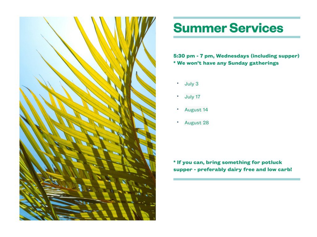 For the summer, we’re pausing our usual Sunday services and hosting midweek gatherings around the table in homes and at St. Benedict’s Monastery—warm, welcoming spaces where we can be present with God and one another. Anyone is free to join; in fact, we would love to have you visit and participate at any time!
